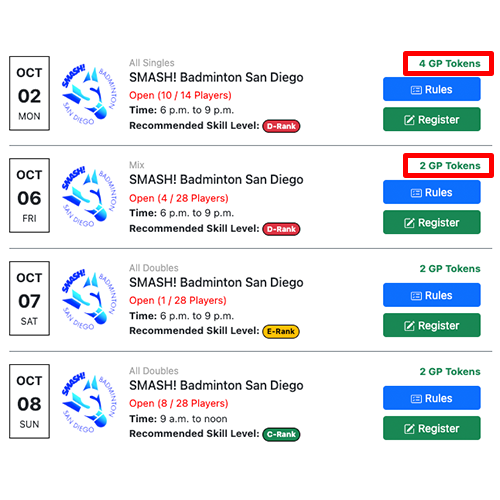 Visit the Leagues page to find available events. The amount of GP Tokens needed to register varies by event type.