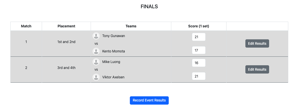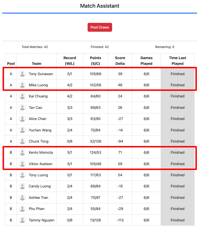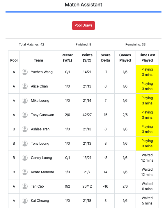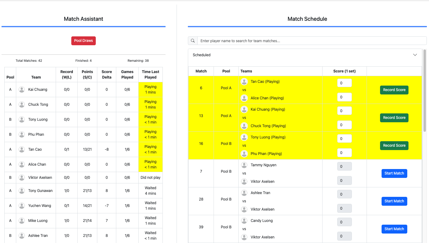 At the start of an event, Pool Draws will be generated automatically and the Event Coordinator will call out matches.