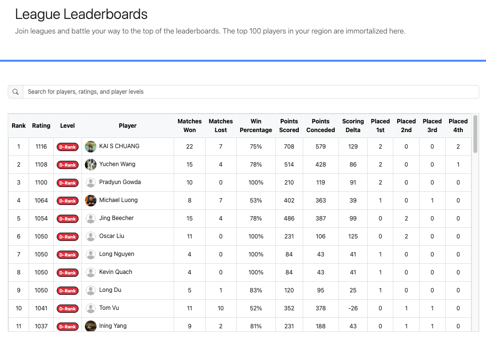 It will track your record, the number of points you earned and lost, your scoring delta, number of games you played, the duration of games being played, and how long you've waited for between matches.