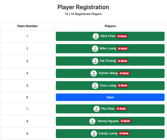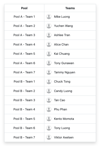 In this example, there are 14 teams, with 2 pools, and 7 teams per pool. The teams in both pools are randomly generated at the start of every League Event. Each team will face off against all other teams in the same pool (play 6 games) and will play 1 set (first to 21).