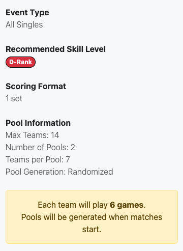 On the event registration page, there will be details highlighting the Event Type, Recommended Skill Level, Scoring Format, and Pool Information.