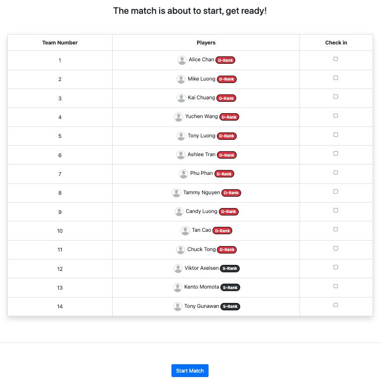 At the start of every League Match, a designated Event Coordinator will go on the Match Login page and enter an Event Code to start the check in process.