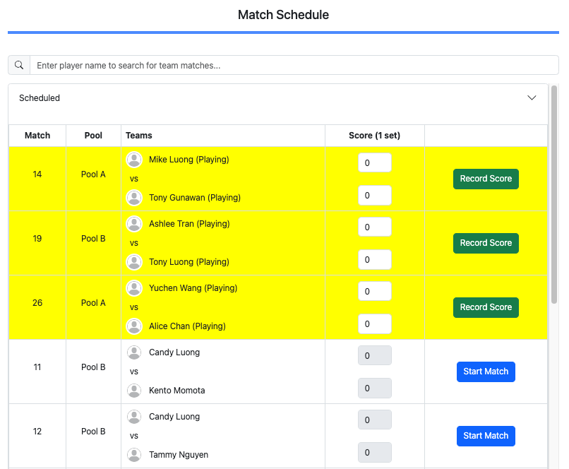 The Match Schedule component leverages our automated scheduling system that prioritizes matches for teams that have waited the longest.